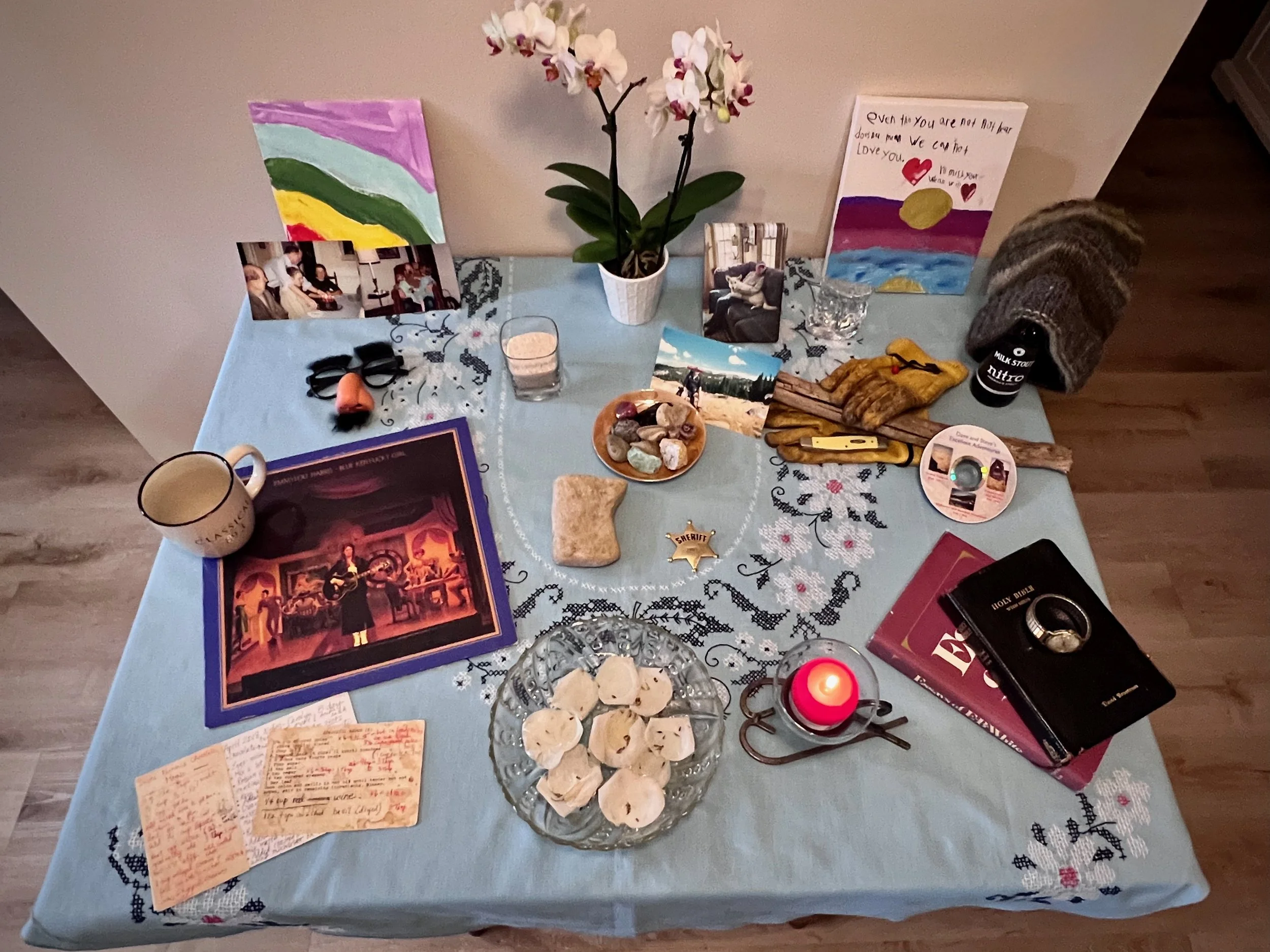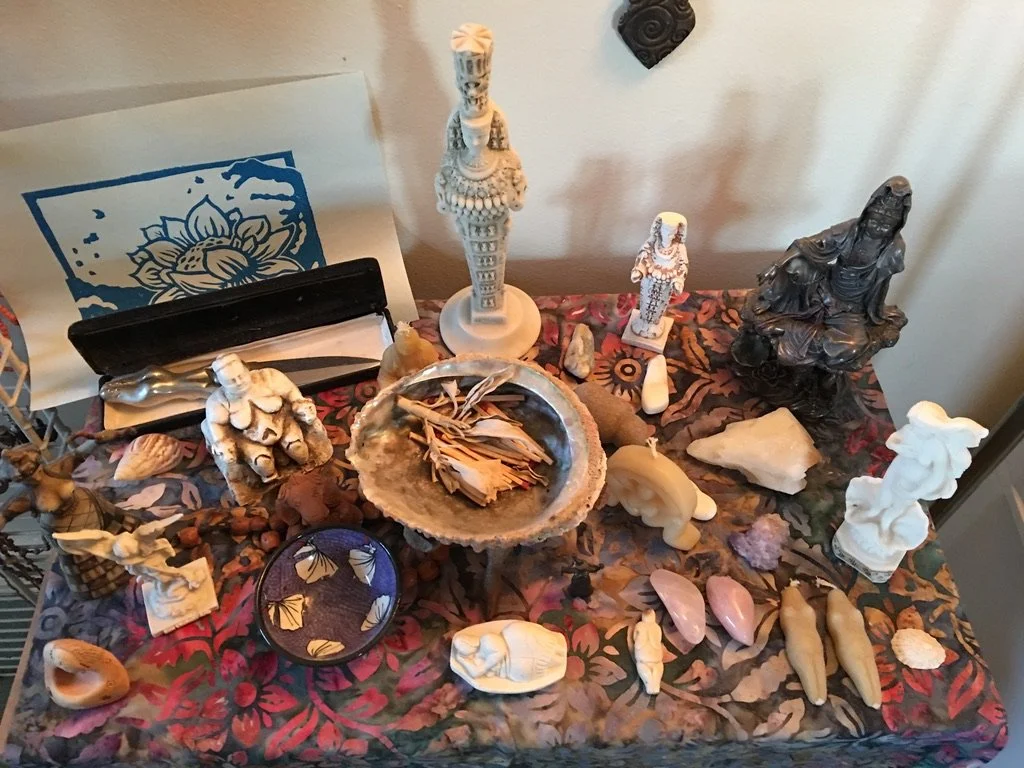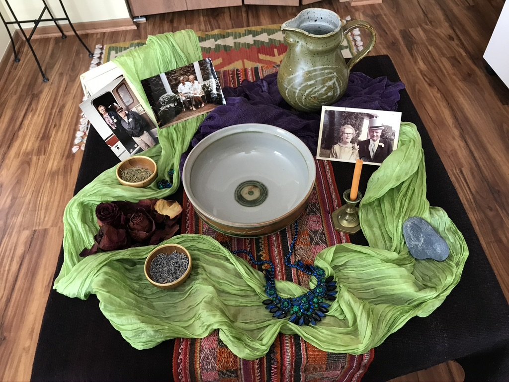 Altars created for a Water Ritual to Honor Ancestors. Participants were invited to make their own personal Altar of Remembrance to honor their loved ones. This provided maximum privacy through an online collective experience.