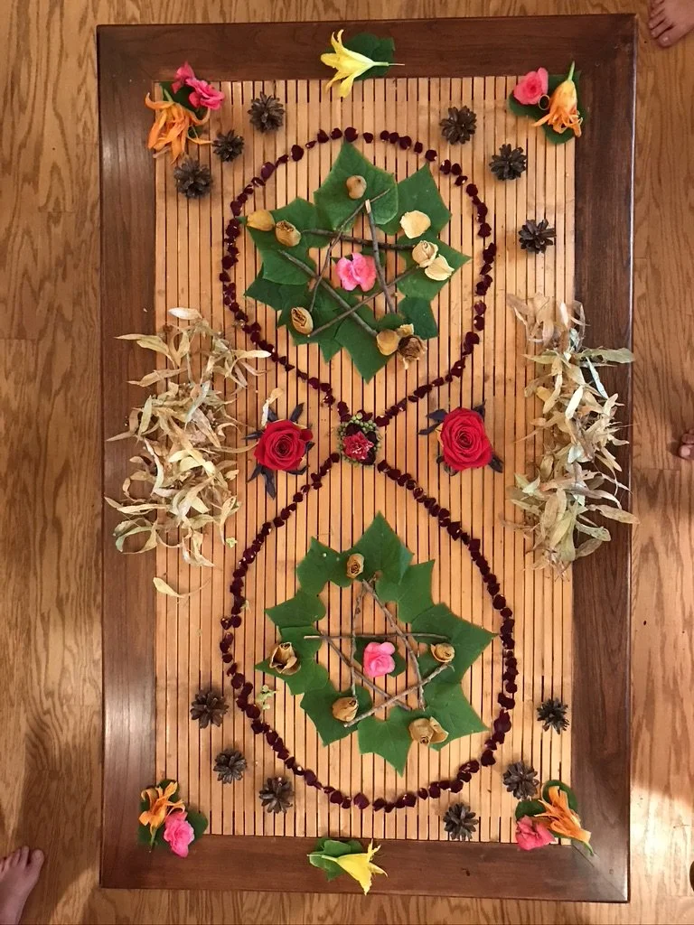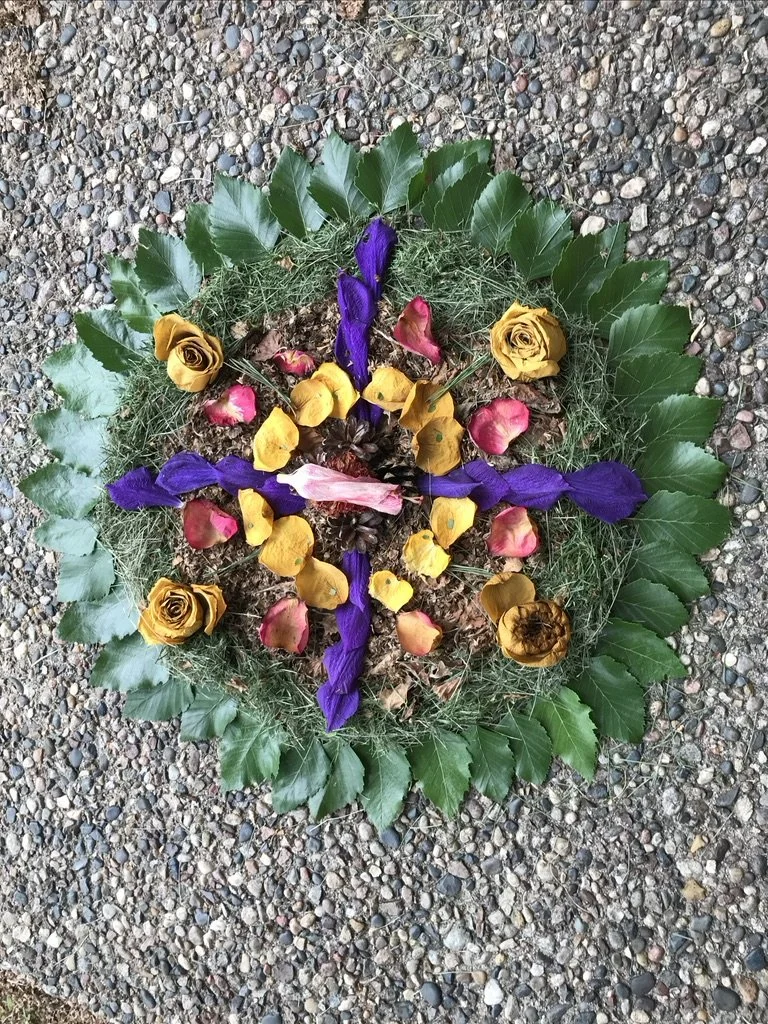 This ritual process was created to release personal anger in a small group. A safe space was made to smash small pots representing each person’s anger. Then, the shards from the pots along with clay were used to create something beautiful, a personal mandala.